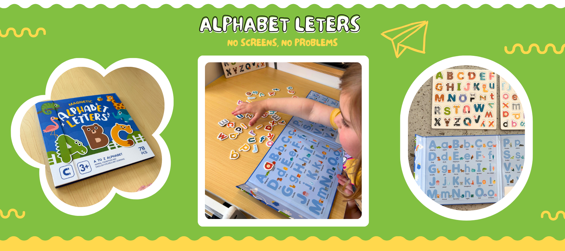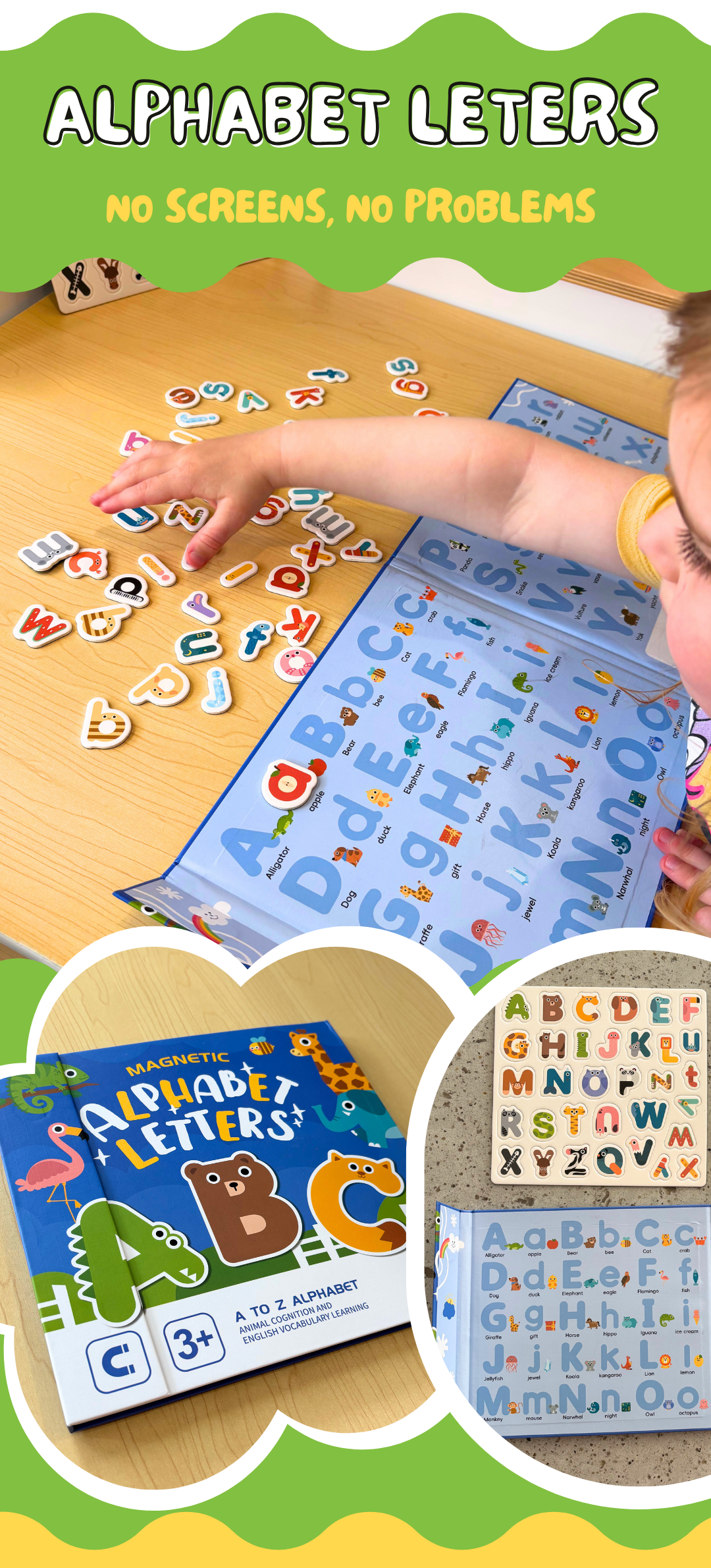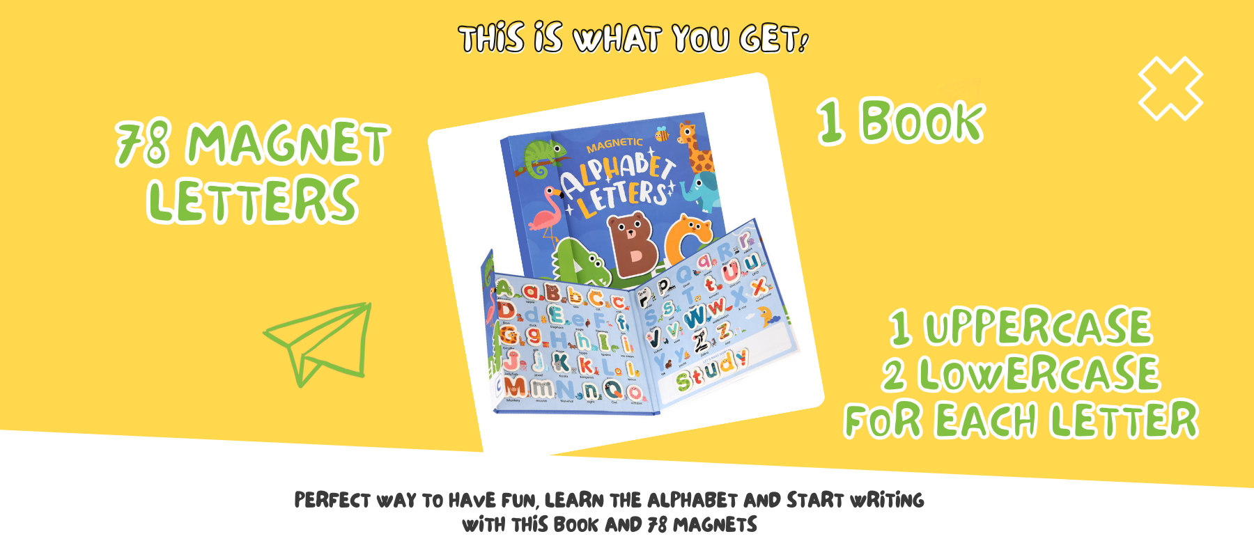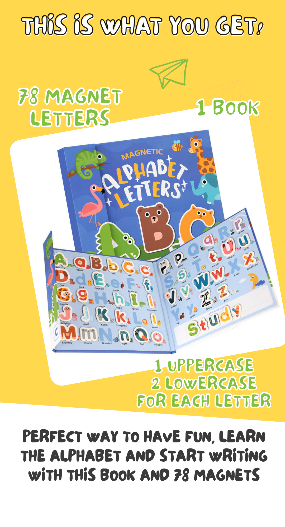 Perfect way to have fun, learn the alphabet and start writing with this book and 72 magnets